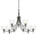 The Keating 9-light chandelier combines rustic industrial charm with refined craftsmanship. Its hammered water glass shades create captivating light patterns while the deeply textured Antique Black Iron finish adds authentic character to any space.