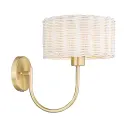 The Erma wall sconce combines handwoven white wicker with brushed champagne brass for a warm, textural look. Its plug-in design offers easy installation without hardwiring, while damp location rating makes it bathroom-safe.