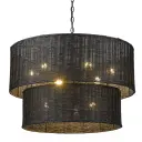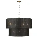 The Erma 9-light chandelier combines hand-woven black wicker with a sleek matte black frame, creating a bold textural statement that filters light beautifully. Its adjustable height and generous 28-inch width make it versatile for various ceiling heights and room sizes.