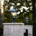 The Spiral Frame Solar Post Light combines Spanish-inspired iron design with modern solar technology. Features 11 LEDs providing 150 lumens of warm white light for up to 20 hours on a full charge, all in a durable cast aluminum frame.