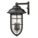The Dylan 3-Light Wall Sconce combines oil-rubbed bronze steel construction with clear seeded glass globes for timeless outdoor appeal. Its 17.5-inch height and triple candelabra design provide ample illumination.