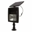 Energy-efficient solar flood light with warm-white and bright-white LED options, delivering 250 lumens for up to 20 hours. Features detachable solar panel, multiple mounting options, and weatherproof cast aluminum construction.