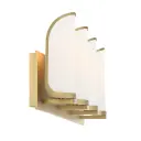 The Bishop Crossing vanity light combines contemporary styling with timeless brass warmth. Four etched white glass shades provide even, flattering illumination perfect for grooming tasks while the 33.5-inch width suits medium to large vanities.