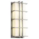 The Telshor Large wall sconce delivers striking modern geometry with vertical fins and warm LED illumination through a matte white diffuser. Wet-rated and dimmable, it combines architectural flair with durability.