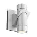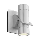 The Razzo LED outdoor wall sconce combines sleek contemporary design with practical dual-direction lighting. Its brushed aluminum finish and clear glass diffusers create sophisticated architectural impact while delivering 680 lumens of warm 3000K light both up and down. Wet-rated for durability in any weather condition.