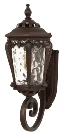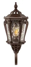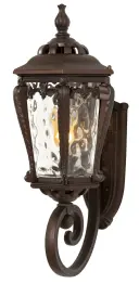 The Stratford wall sconce combines traditional design with weather-resistant cast aluminum and distinctive hammered water glass. At 23 inches tall, it provides substantial illumination for outdoor spaces with timeless appeal.