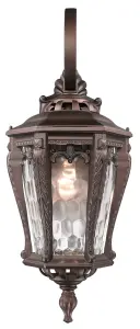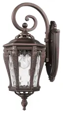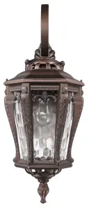 The Stratford wall sconce combines traditional styling with weather-resistant cast aluminum and distinctive hammered water glass. At 23 inches tall, it provides substantial presence for outdoor entryways and patios.