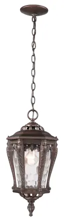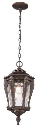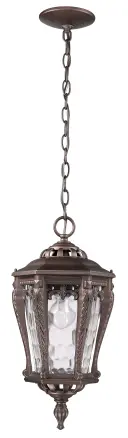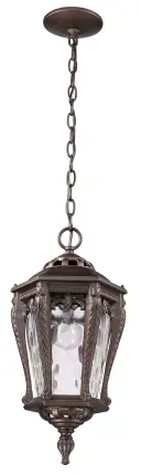 The Stratford hanging lantern combines traditional design with weather-resistant cast aluminum and distinctive hammered water glass. Its compact 9.5" width makes it ideal for covered porches and entryways.