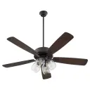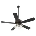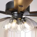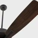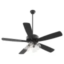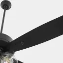 The Ovation ceiling fan combines contemporary styling with practical functionality. Its matte black finish and walnut blades create a sophisticated look, while clear glass shades provide ample lighting for medium-sized rooms.