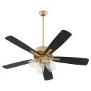 The Ovation ceiling fan combines functional cooling with sophisticated lighting through its 4-light clear glass fixture. Slightly curved blades and aged brass finish create a refined transitional aesthetic suitable for various interior styles.