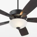 The Ovation ceiling fan combines functional cooling with understated style. Its slightly curved blades and modest housing create a refined look, while the satin opal bowl light provides ambient illumination for any room.