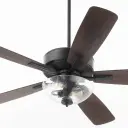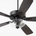 The Ovation ceiling fan combines functional cooling with understated style. Its slightly curved blades and matte black finish complement various decor styles, while the clear seeded glass bowl adds visual interest and ambient lighting.