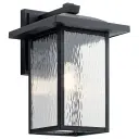 The Capanna Outdoor Wall Light combines textured black finish with clear water glass for a transitional look that works in both residential and commercial settings. Wet-rated and dimmable for versatile outdoor use.