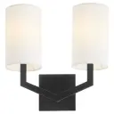 The Bolivar 2-Light Wall Sconce features a signature arrow motif with overlapping angles that create visual interest. The matte black finish paired with white fabric shades delivers a striking contrast perfect for transitional interiors.