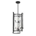The Bella Collina 6-light pendant combines sleek coal black steel with textured rock-pressed glass for a sophisticated modern look. Its compact 14-inch width makes it ideal for smaller dining areas and kitchen islands.
