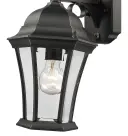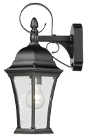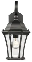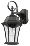 5423BK Matte Black Cast Aluminum 1-100W Medium 16″ H x 8″ W x 10″ ext. 7″ x 4.5″ 5″ Clear beveled glass panes Spec...