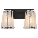 The Prestige 2-Light Vanity makes a dramatic statement with its clear alabaster glass panels that resemble chiseled ice. Angular matte black frames and screw details create an industrial-contemporary aesthetic perfect for modern bathrooms.
