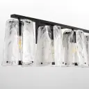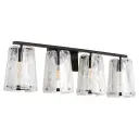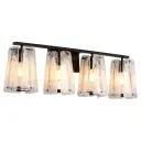 The Prestige 4-Light Vanity makes a dramatic statement with its clear alabaster glass panels that resemble chiseled ice. Angular matte black frames and screw details create an industrial-contemporary aesthetic perfect for modern bathrooms.