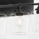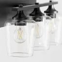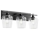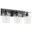 The Veno 3-Light Vanity combines traditional angular frames with clear glass shades in a sophisticated matte black finish. Perfect for bathrooms seeking timeless appeal with contemporary edge.