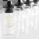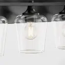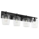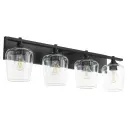 The Veno 4-Light Vanity combines angular frames with clear glass shades for traditional appeal with a contemporary edge. The matte black finish adds modern sophistication to bathroom spaces.