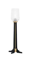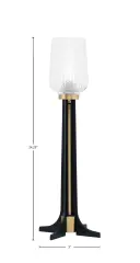 This contemporary accent lamp combines matte black and new age brass finishes for a sophisticated look. The 5" clear textured glass shade adds visual interest while providing warm ambient lighting. At 24.25" tall, it's perfectly sized for bedside tables, end tables, or office desks.