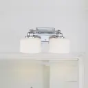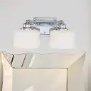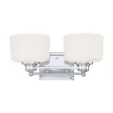 The Soho 2-Light Vanity delivers clean, modern styling with polished chrome finish and satin white glass shades. Its minimalist design with airplane cable accents provides functional lighting without overwhelming the space.