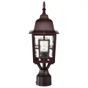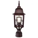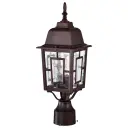 The Banyan post light combines geometric architectural details with clear water glass for a sophisticated outdoor lighting solution. Its 17-inch height and rustic bronze finish make it ideal for pathways, driveways, and entryways.