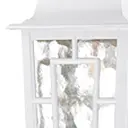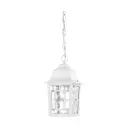 The Banyan outdoor hanging lantern combines clean architectural lines with textured water glass for visual interest. Its geometric inlays and white finish create a fresh, coastal-inspired look perfect for covered outdoor spaces.