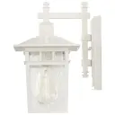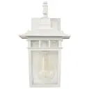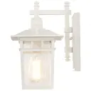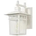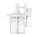 The Cove Neck wall lantern offers a unique fusion of Eastern and American design elements in a compact 12-inch fixture. Its white finish and clear seed glass create a clean, versatile look that enhances curb appeal.