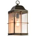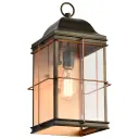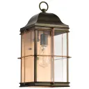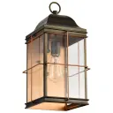 The Howell large outdoor wall lantern combines understated elegance with vintage appeal. Its bronze finish with copper accents and clear seeded glass create warm, inviting illumination for entryways and outdoor spaces.