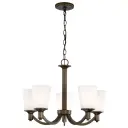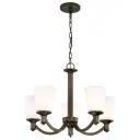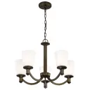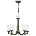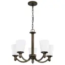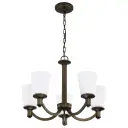 The Laguna chandelier combines forest bronze finish with elegant white glass shades, creating a versatile lighting solution that complements both traditional and contemporary interiors. Five lights provide ample illumination for dining and living spaces.