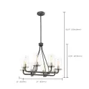 The Sherwood chandelier combines iron black with brushed nickel accents for a contemporary yet timeless look. Eight lights behind clear glass provide ample illumination for dining and living spaces.