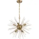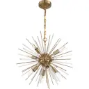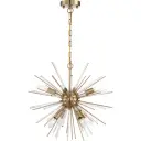 The Cirrus chandelier delivers mid-century modern sophistication with its satellite-inspired starburst design. Eight lights radiate from a vintage brass center sphere along elegant glass rod arms, creating cosmic radiance and visual drama.