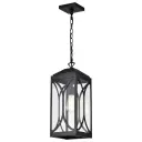 The Oaklyn hanging lantern combines traditional lantern styling with modern matte black finish and clear glass panels. Perfect for creating welcoming outdoor ambiance at entryways, patios, and covered porches.
