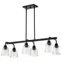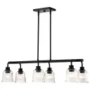 The Grayson 6-Light Island Pendant combines rustic charm with contemporary design, featuring a bold matte black finish and textured clear ribbed glass. Perfect for creating inviting kitchen and dining spaces with character.