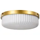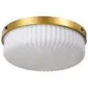 The Solara flush mount combines traditional elegance with contemporary simplicity. Its natural brass finish and frosted ribbed glass create a soft, inviting glow perfect for intimate spaces requiring low-profile lighting.