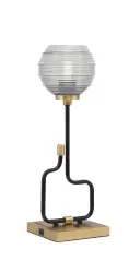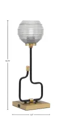 The Sandia Accent Lamp combines contemporary style with practical functionality. Featuring a striking matte black and aged brass finish with textured ribbed glass, this compact lamp includes built-in USB ports for device charging—perfect for modern living spaces.