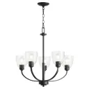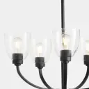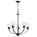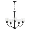 The Reyes 5-Light Chandelier combines sleek modern lines with transitional appeal, featuring clear seeded glass shades and textured black finish. Its clean design blends seamlessly with most aesthetics while making a statement.