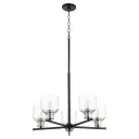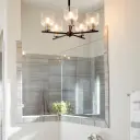 The Monarch chandelier masterfully combines traditional elegance with modern sophistication through its distinctive two-tone black and satin nickel finish. Clear fluted glass shades and sharp-angled arms create visual interest while maintaining timeless appeal.