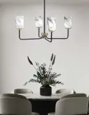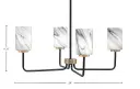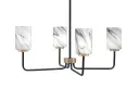 The Sandia 4 Light Chandelier combines contemporary design with luxurious finishes. Matte Black paired with warm New Age Brass creates sophisticated contrast, while onyx swirl glass shades add depth and visual interest.