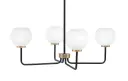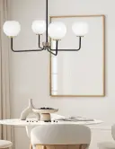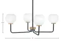 The Sandia 4-Light Chandelier combines bold matte black with warm brass accents for a refined transitional aesthetic. White marble glass shades provide soft, diffused lighting with subtle texture, perfect for dining spaces.