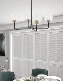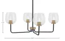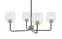 The Sandia 4-Light Chandelier combines sophisticated matte black and brass finishes with distinctive clear bubble glass shades. Its 30-inch width makes it perfect for medium-sized dining areas and kitchen islands.