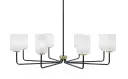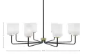The Sandia 8-Light Chandelier combines industrial-inspired matte black with warm new age brass accents and elegant white marble glass shades. Its substantial 41.25-inch width makes a dramatic statement over large dining tables or kitchen islands.