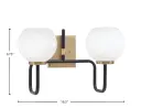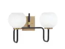 The Sandia 2-Light Bath Bar combines matte black and new age brass finishes for a sophisticated transitional look. White marble glass shades provide soft, flattering illumination perfect for bathroom vanities.