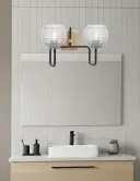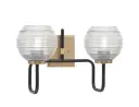 The Sandia 2 Light Bath Bar combines matte black and brass finishes for a refined, modern look. Clear ribbed glass shades add visual texture while providing excellent illumination for bathroom vanities and powder rooms.
