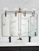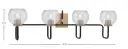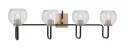 The Sandia 4 Light Bath Bar combines striking Matte Black and New Age Brass finishes with unique Smoke Bubble Glass shades. This 37.25-inch fixture provides ample illumination for larger vanities while adding modern sophistication.