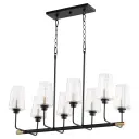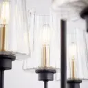 The Dalia chandelier combines minimalist linear design with soft angular curves and tulip-shaped fluted glass shades. Its two-toned aged brass and black finish creates sophisticated visual interest, while damp rating allows use in covered outdoor spaces.