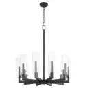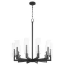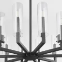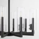 The Harbin 10-light chandelier makes a striking statement with its strong linear architecture and sleek cylindrical clear glass shades. The textured black finish adds industrial edge while maintaining modern sophistication.