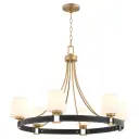The Hidalgo chandelier elevates traditional design with mixed materials and fashion-forward details. Leather trims with buckle accents add unexpected texture to the aged brass crown-style frame, creating a sophisticated focal point.