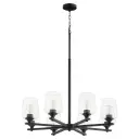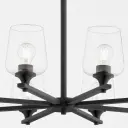 The Veno 8-Light Chandelier combines angular metal frames with clear glass shades for timeless traditional appeal. The matte black finish adds contemporary edge while maintaining classic comfort and versatility.